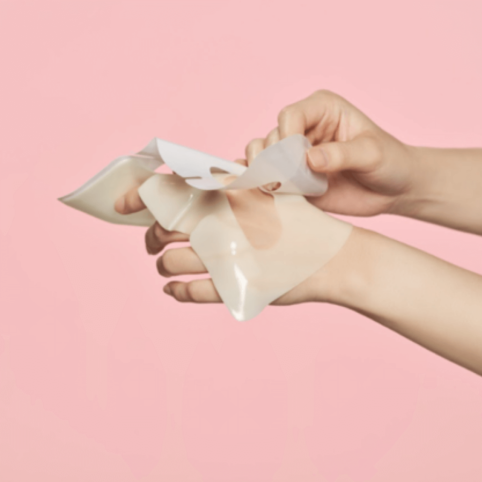 Основа маски выполнена из гидролизованного коллагена, который плотно прилегает, повторяет контуры лица и надёжно фиксируется. Во время использования маска транспортирует активные компоненты, которыми пропитано лекало, и становится более прозрачной.